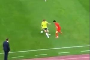 现场球迷实拍王钰栋面对澳大利亚球员穿裆过人后转移球。
