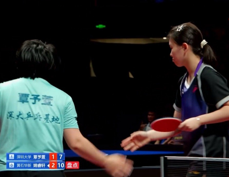 姚睿轩在第二盘3比1击败了覃予萱,帮助黄石华新女乒扳平了总比分。第三盘申裕斌在2比3领先的情况下被蒯曼惊险逆转。第四盘韩菲儿3比0击败覃予萱。第五盘,姚睿轩和师姐孙颖莎交手,0比3落败。如果这场比赛蒯曼在第二盘没顶住申裕斌的冲击,深圳大学女乒真就危险了。