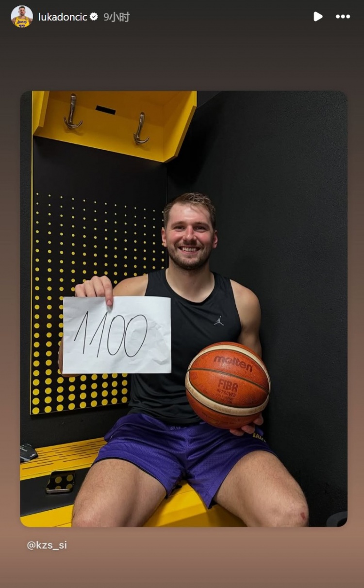 东契奇赛后在更衣室手拿写着1100分的照片,他本人也进行了转发。
