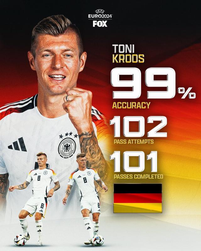 本场德国队仰仗前场攻击群的出色状态,将苏格兰队玩弄于股掌之中,而克罗斯正是这套攻击组合的“激活码”。上半场无论是长传还是短传,甚至是在踉跄之下的几次分边,克罗斯没有一脚球传丢,55次传球全部到位,直到下半场开场阶段,他100%的传球成功率才被中断。
