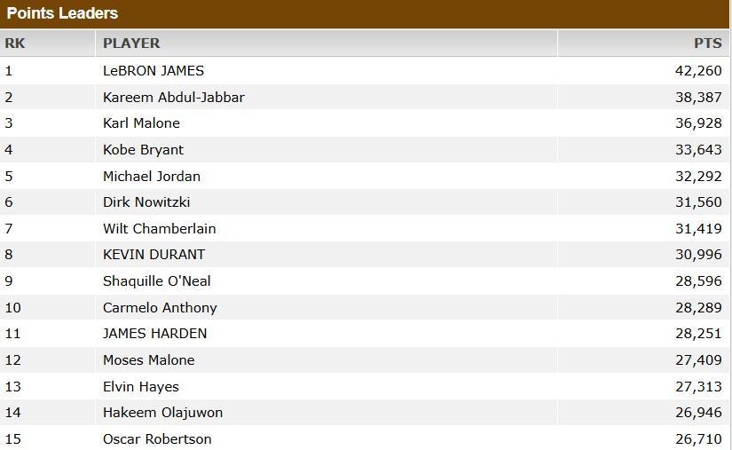 截至目前,詹姆斯以42260分排名NBA历史总得分榜第一位,杜兰特是现役球员得分第二名,目前得到了30996分。