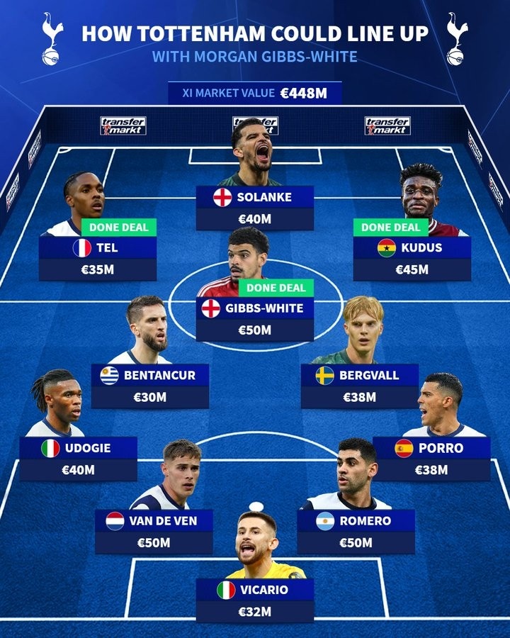 7月12日讯 热刺今夏连续敲定特尔、库杜斯和吉布斯-怀特,《转会市场》也预测了热刺新赛季的主力阵容。
